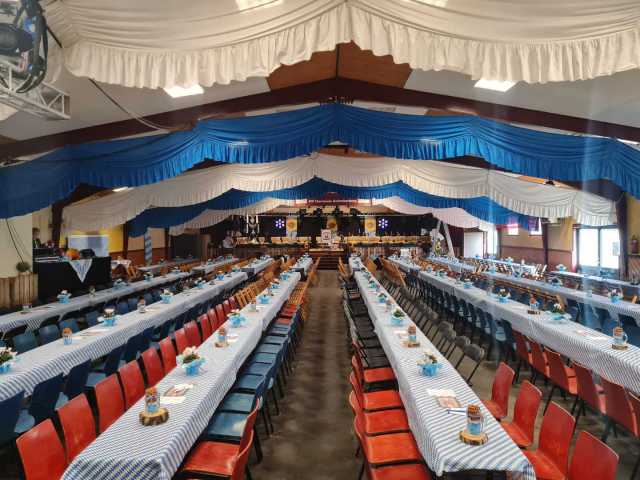 Die geschmückte Vereinshalle anlässlich des Oktoberfestes 2022 des Musikvereins.